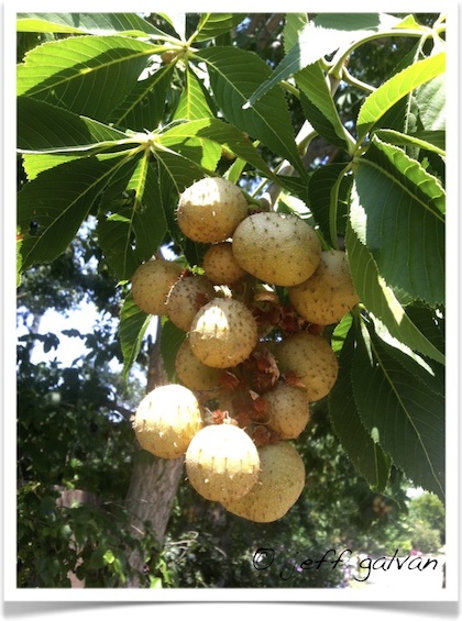 - Fruit has 1-3 shiny nut-like seeds that are covered in an oval, sometimes round, capsule covered with small spines